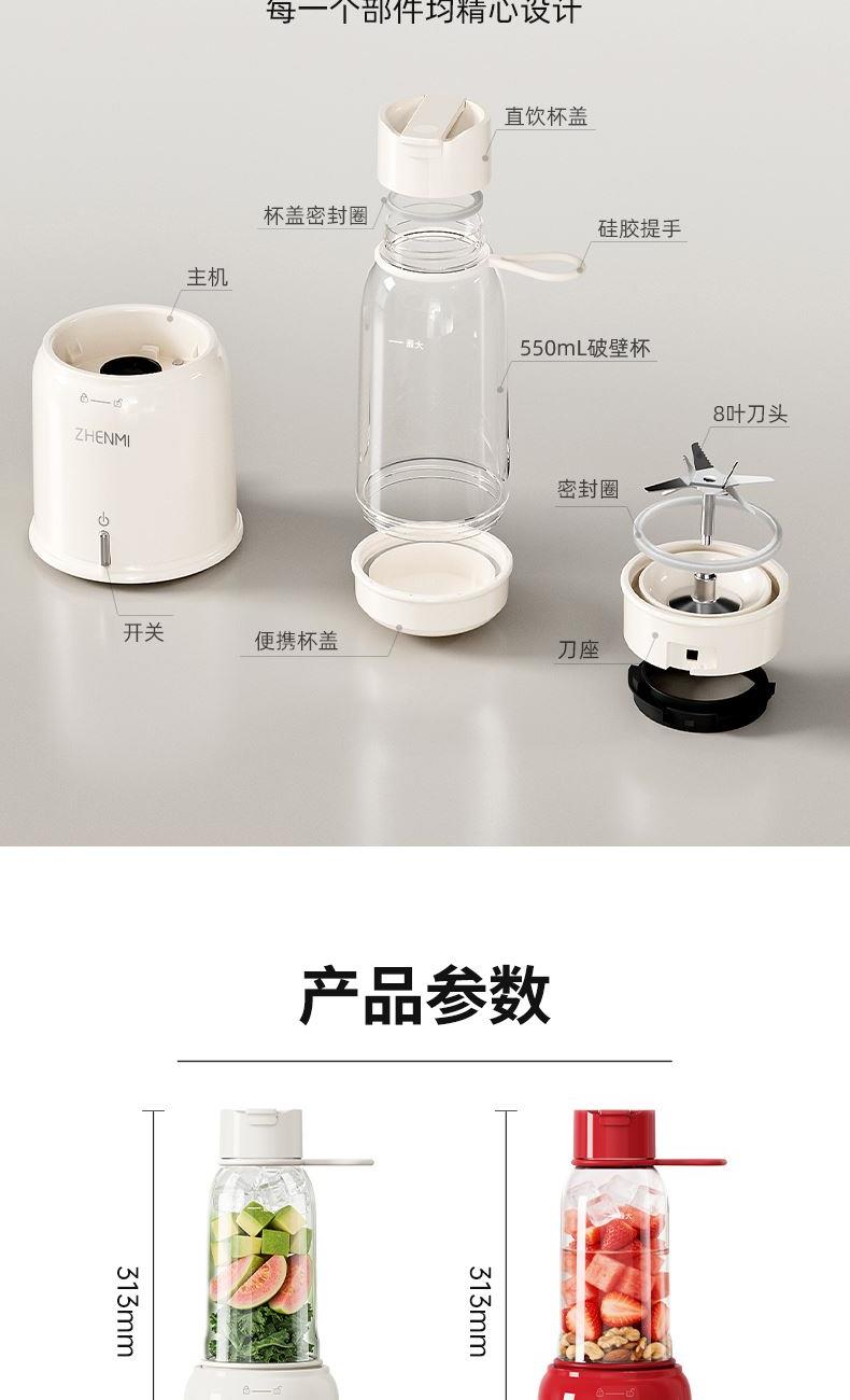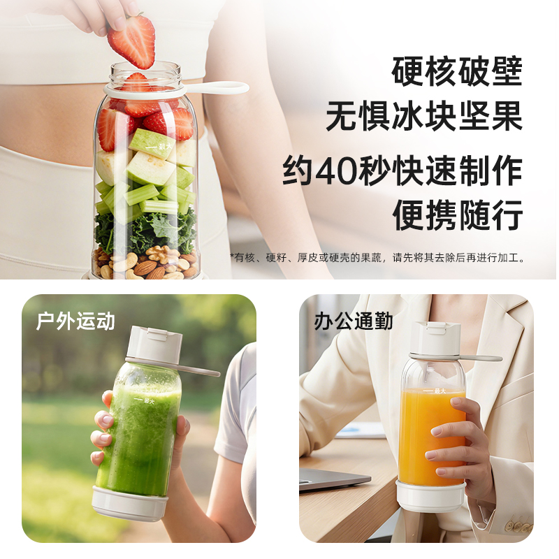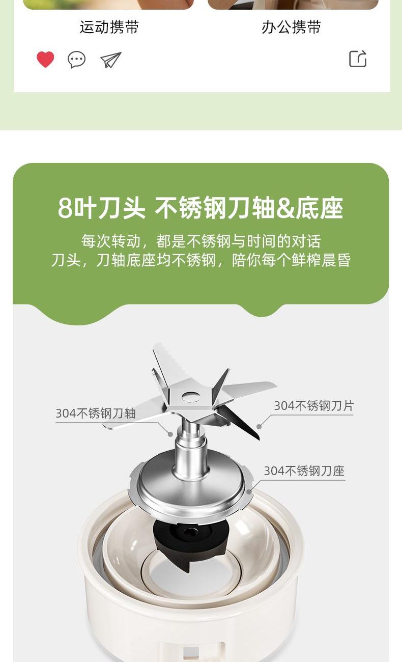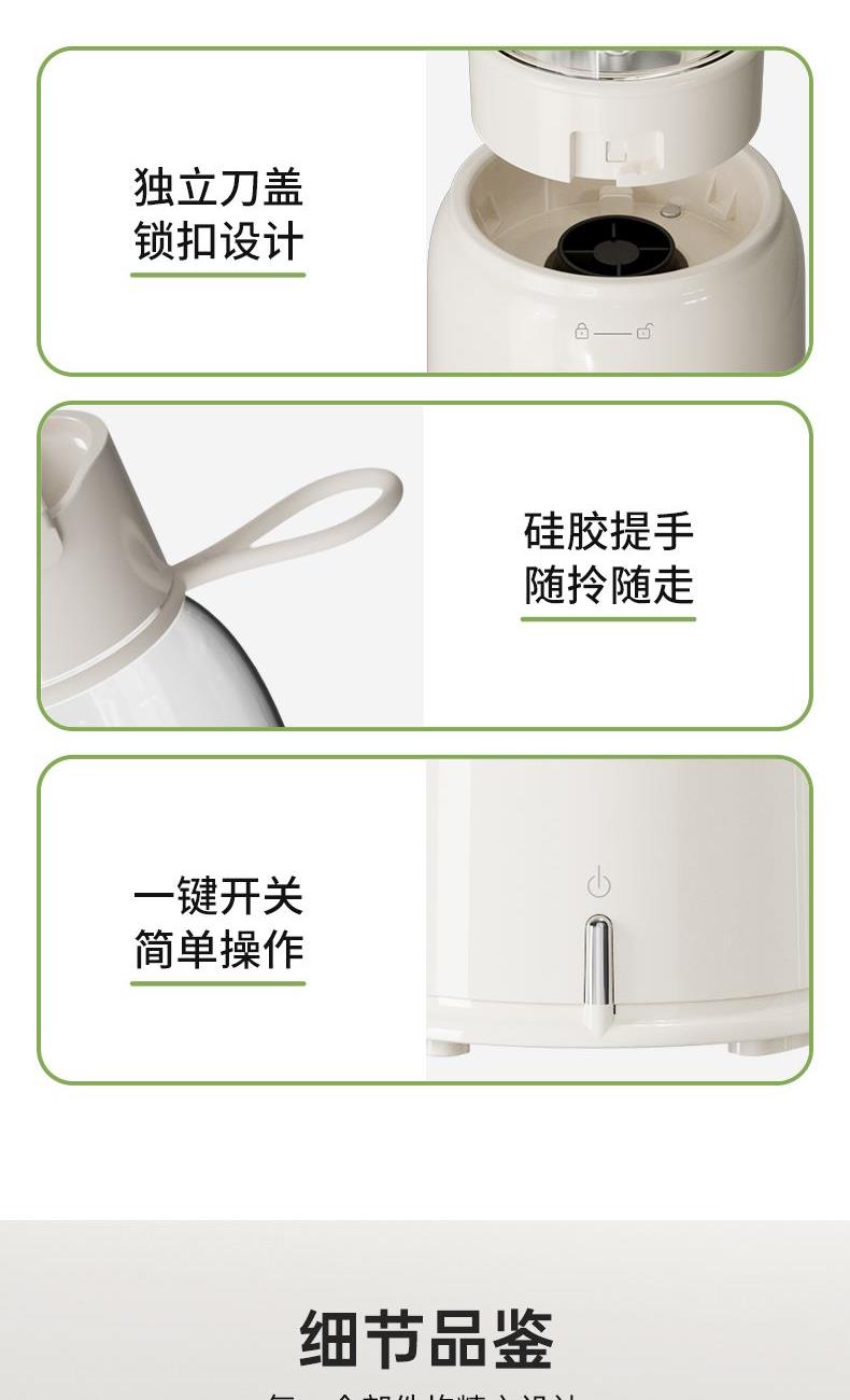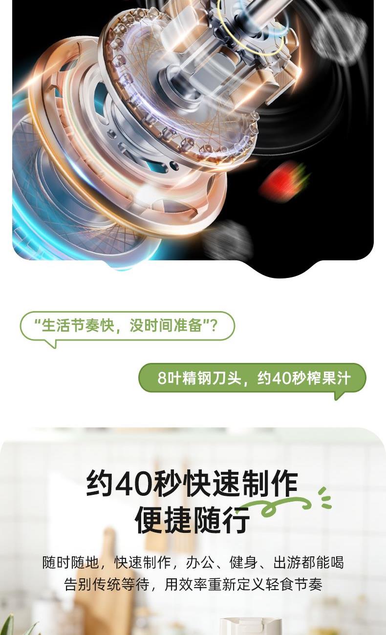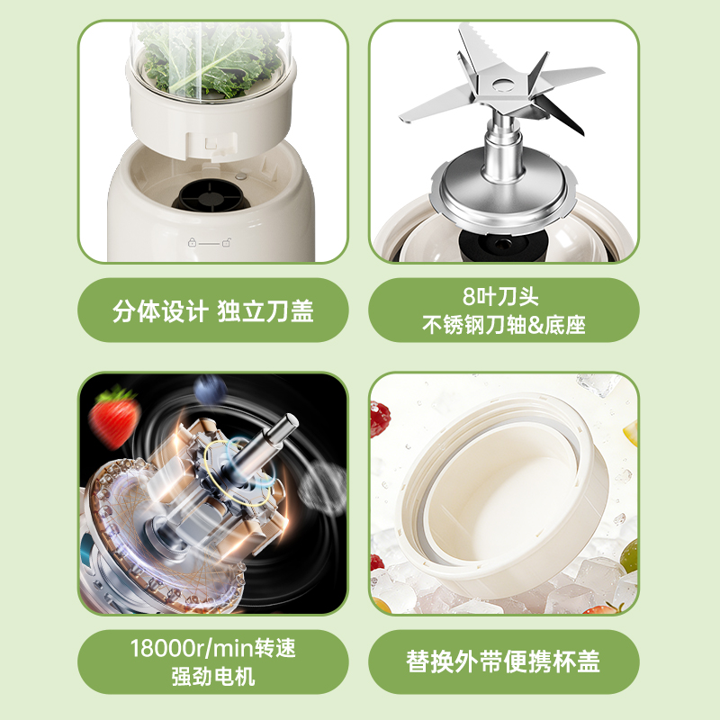 200W强功率,3秒速榨口感细腻; 20000r/min强劲电机搭配4叶精钢刀头,轻松碎冰; 不锈钢刀盘,安全牢固耐用; 上下双开口设计,美味分享轻松续杯; 上盖直饮口,便携外观开盖直饮; 分体设计,清洗方便; 一键启动操作便捷,自动复位安全保护;