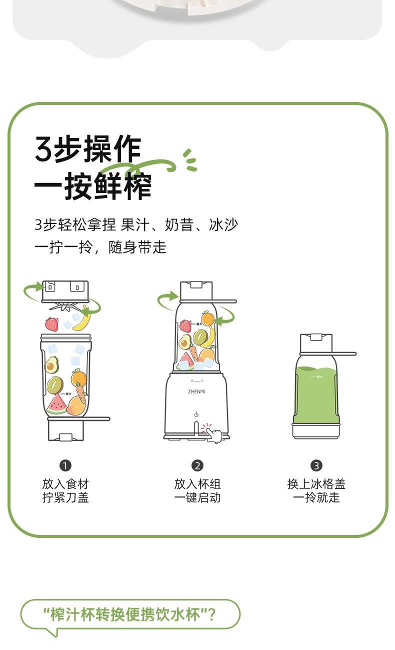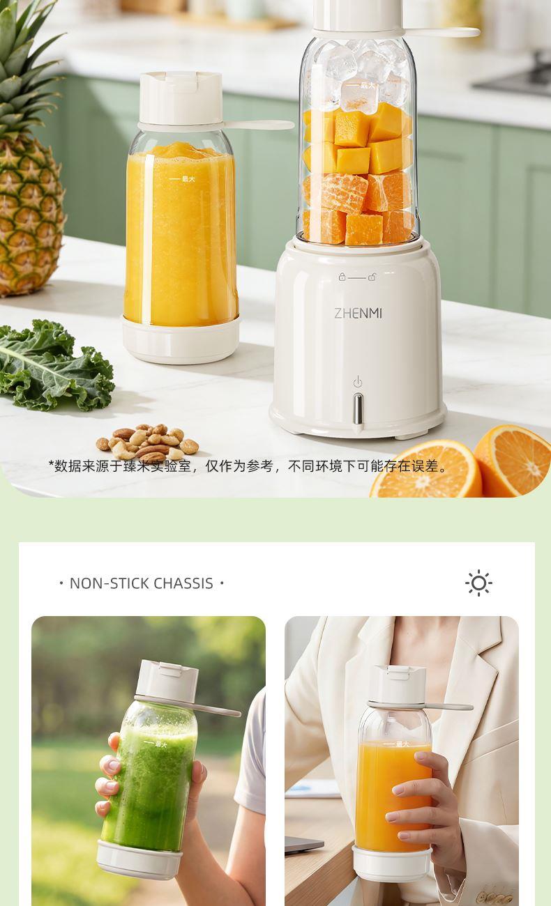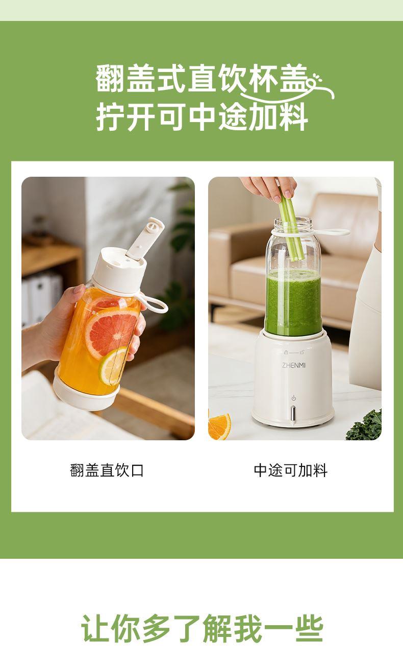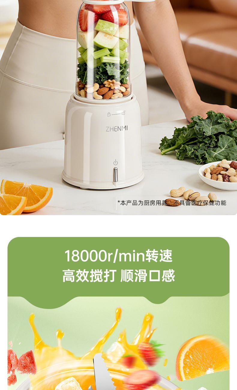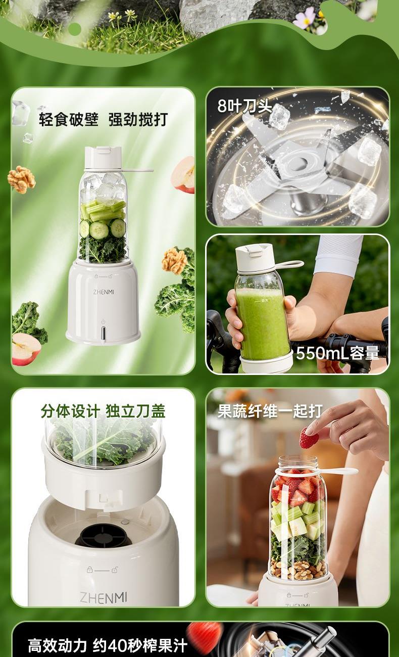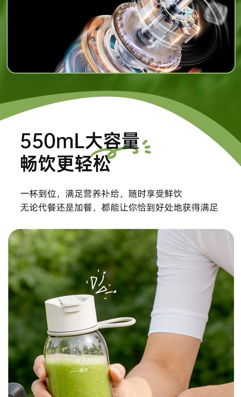 200W强功率,3秒速榨口感细腻; 20000r/min强劲电机搭配4叶精钢刀头,轻松碎冰; 不锈钢刀盘,安全牢固耐用; 上下双开口设计,美味分享轻松续杯; 上盖直饮口,便携外观开盖直饮; 分体设计,清洗方便; 一键启动操作便捷,自动复位安全保护;