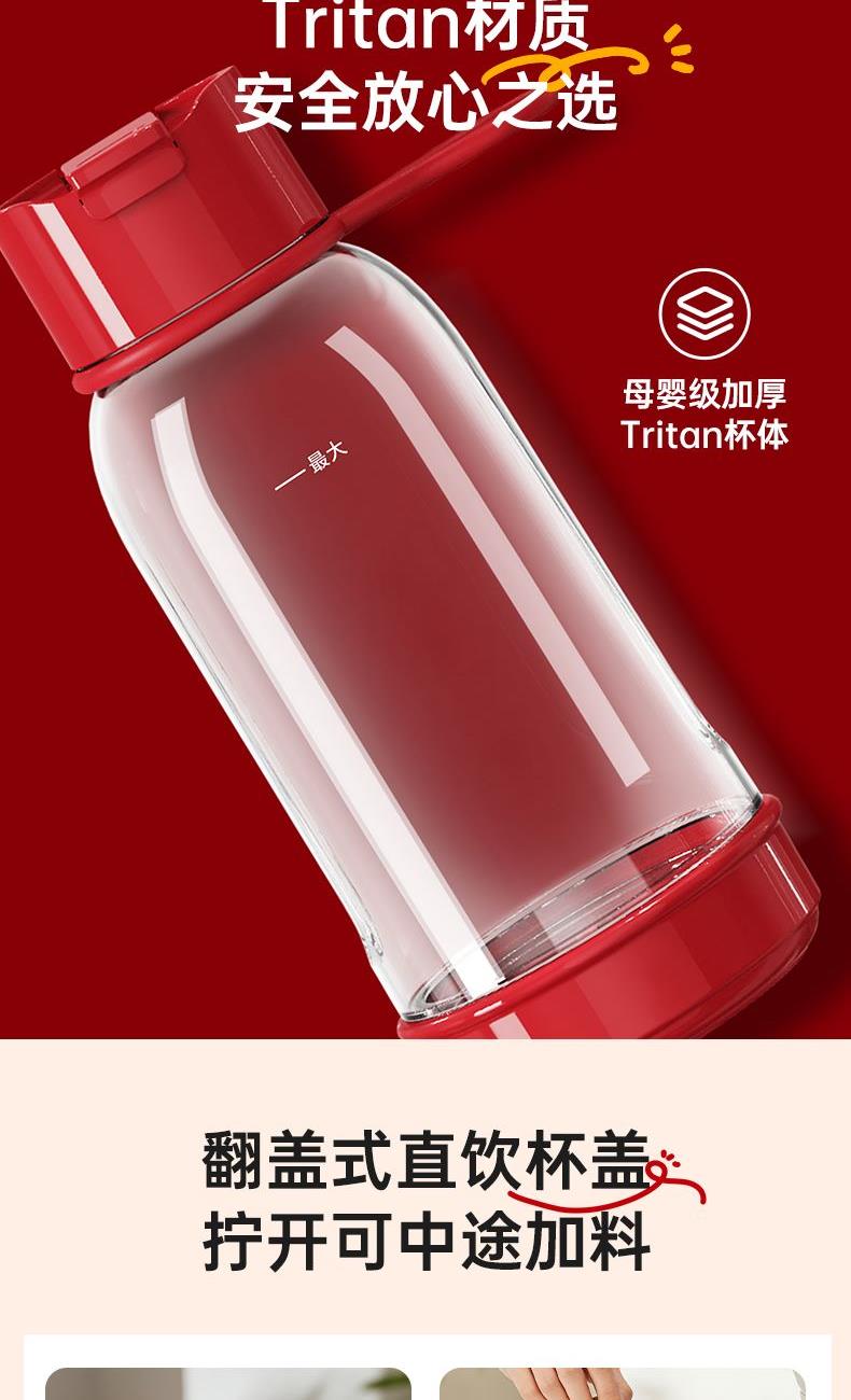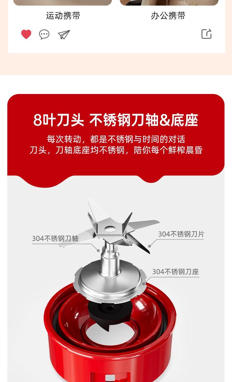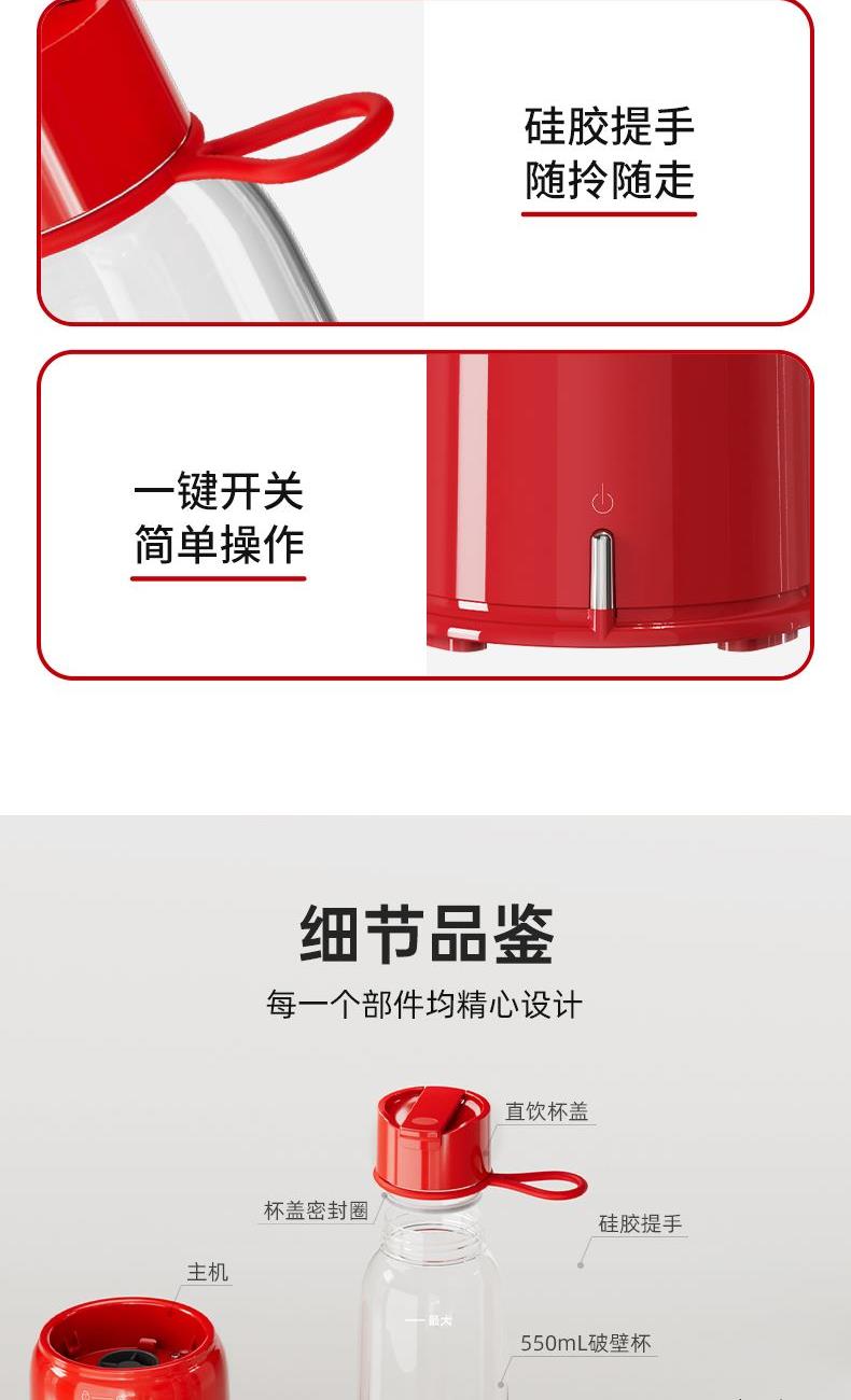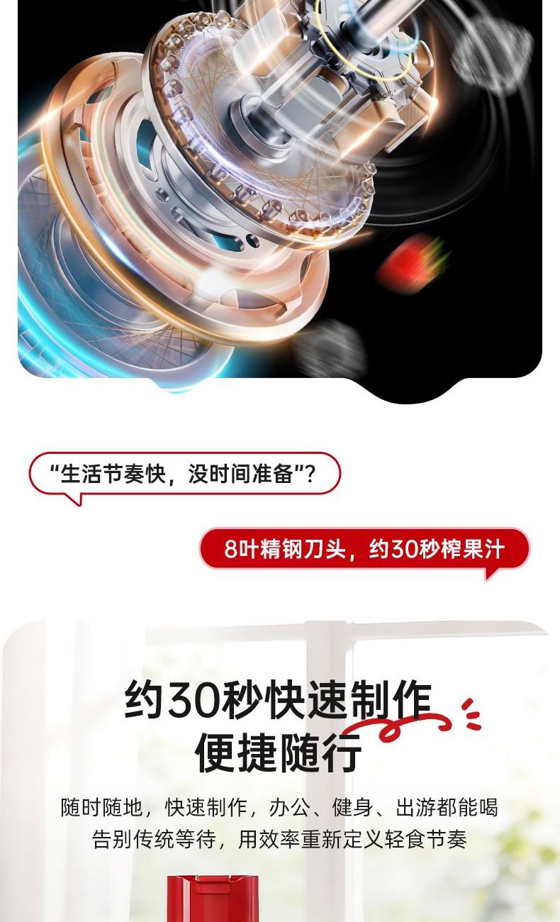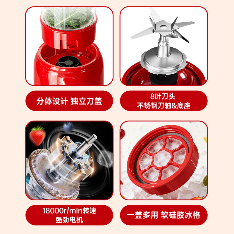 200W强功率,3秒速榨口感细腻; 20000r/min强劲电机搭配4叶精钢刀头,轻松碎冰; 不锈钢刀盘,安全牢固耐用; 上下双开口设计,美味分享轻松续杯; 上盖直饮口,便携外观开盖直饮; 分体设计,清洗方便; 一键启动操作便捷,自动复位安全保护;
